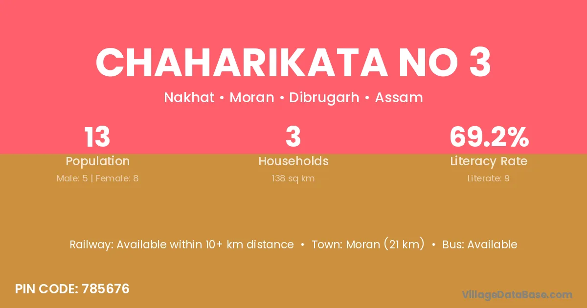 Moran (21 km) is the nearest town to Chaharikata No 3 village for major economic activities and is located approximately 21 km away.