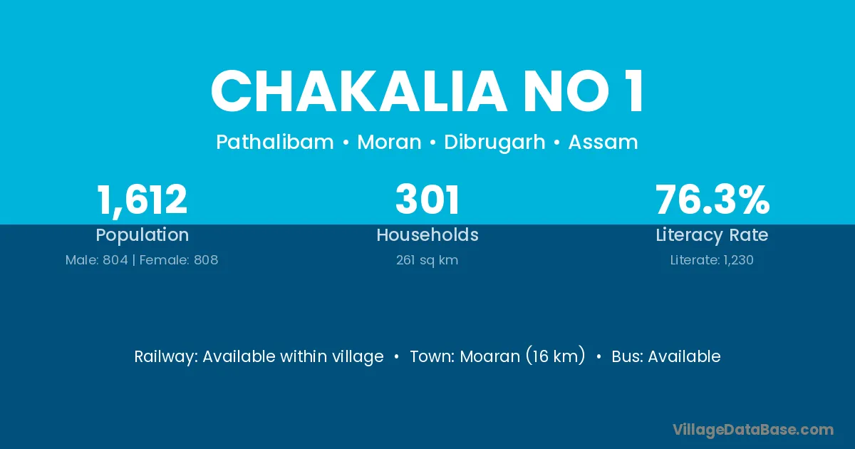 Moaran (16 km) is the nearest town to Chakalia No 1 village for major economic activities and is located approximately 16 km away.