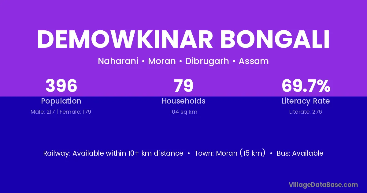 Moran (15 km) is the nearest town to Demowkinar Bongali village for major economic activities and is located approximately 15 km away.