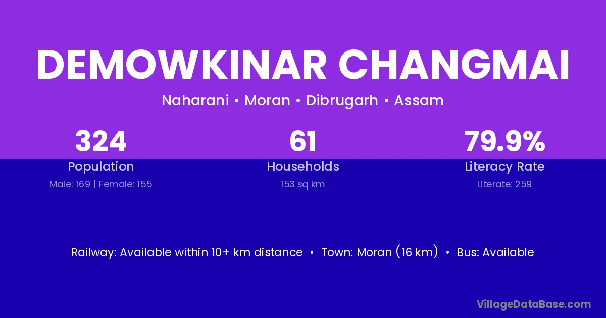 Moran (16 km) is the nearest town to Demowkinar Changmai village for major economic activities and is located approximately 16 km away.