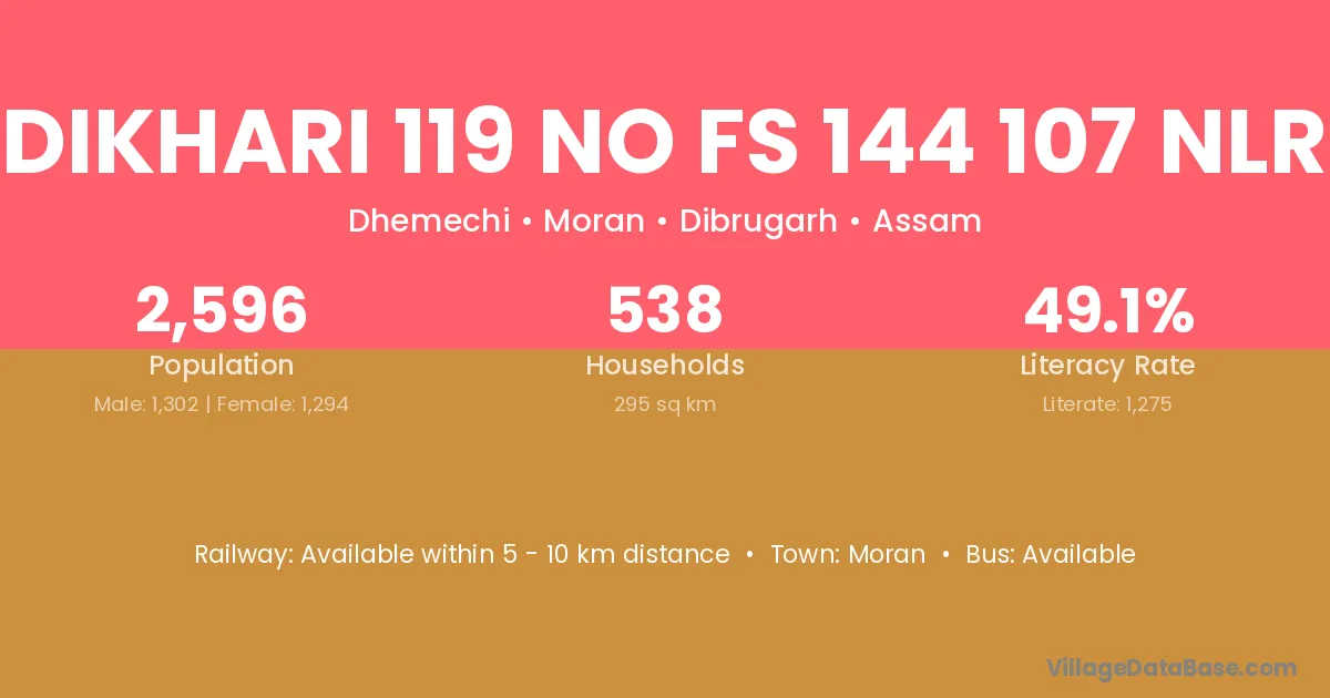 Dikhari 119 No Fs 144 107 Nlr village has a total population of 2,596 people, of which 1,302 are males and 1,294 are females.