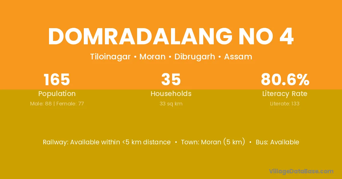 Moran (5 km) is the nearest town to Domradalang No 4 village for major economic activities and is located approximately 5 km away.