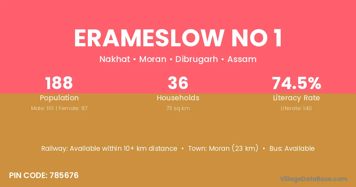 The literacy rate of Erameslow No 1 village is 74.47%. Male literacy stands at 79.21% and female literacy at 68.97%.