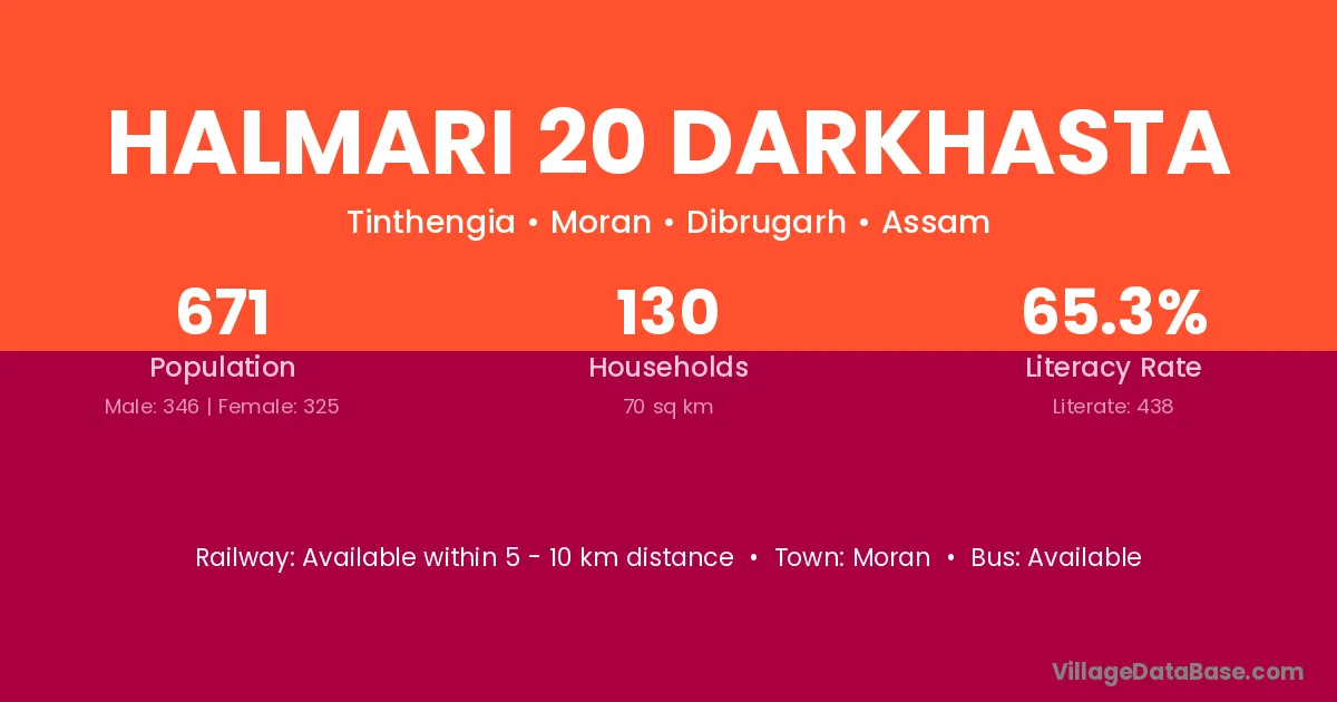 Halmari 20 Darkhasta village has a total population of 671 people, of which 346 are males and 325 are females.