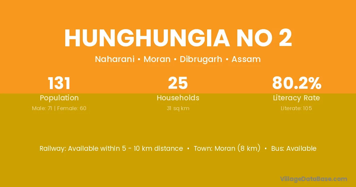 Moran (8 km) is the nearest town to Hunghungia No 2 village for major economic activities and is located approximately 8 km away.