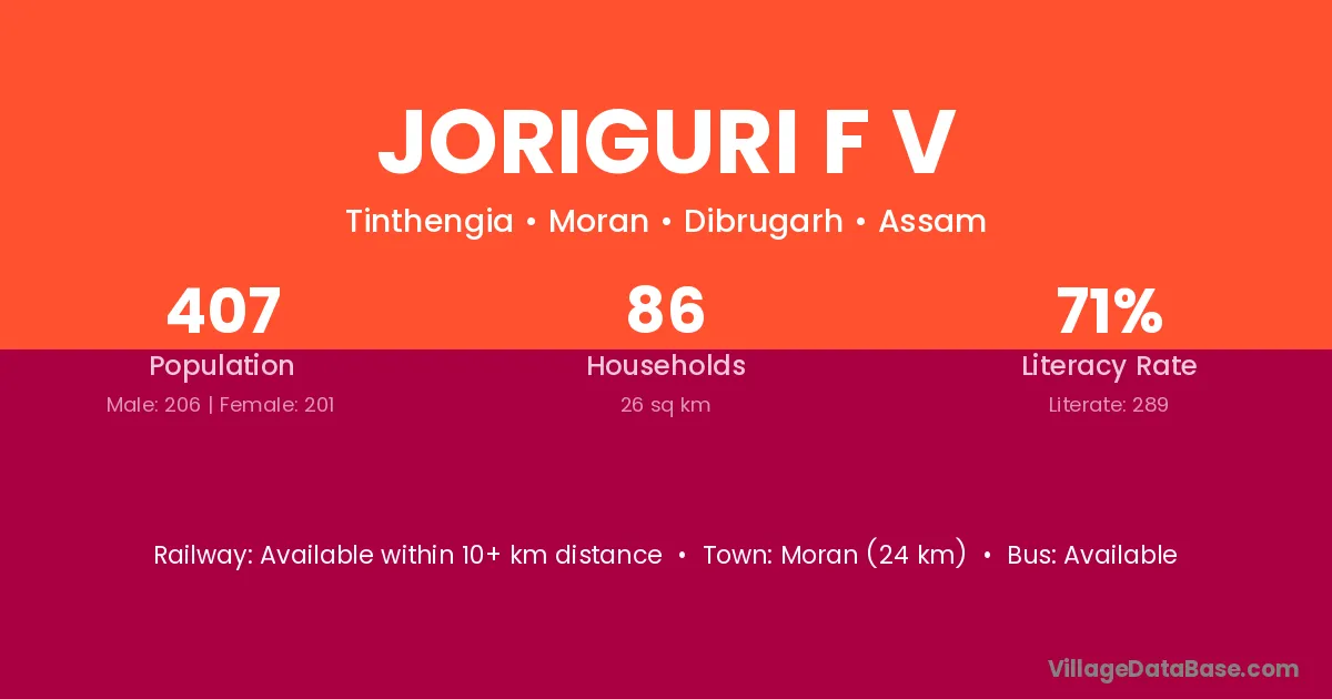 Moran (24 km) is the nearest town to Joriguri F V village for major economic activities and is located approximately 24 km away.
