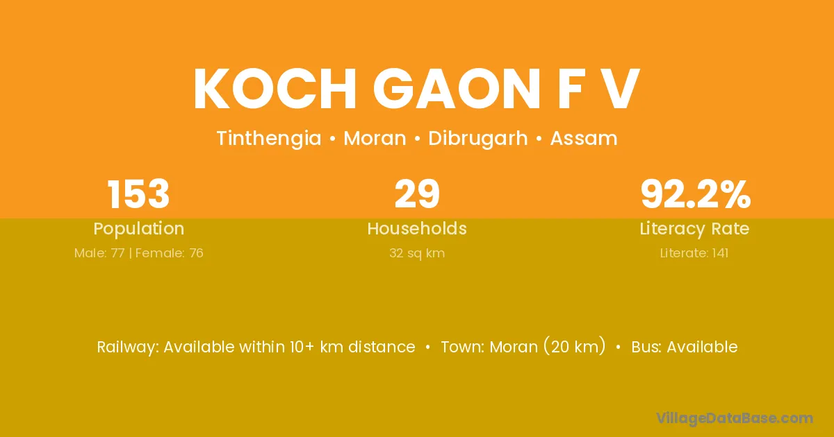 Koch Gaon F V village has a total population of 153 people, of which 77 are males and 76 are females.