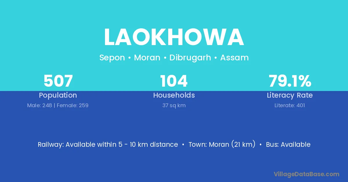 Moran (21 km) is the nearest town to Laokhowa village for major economic activities and is located approximately 21 km away.
