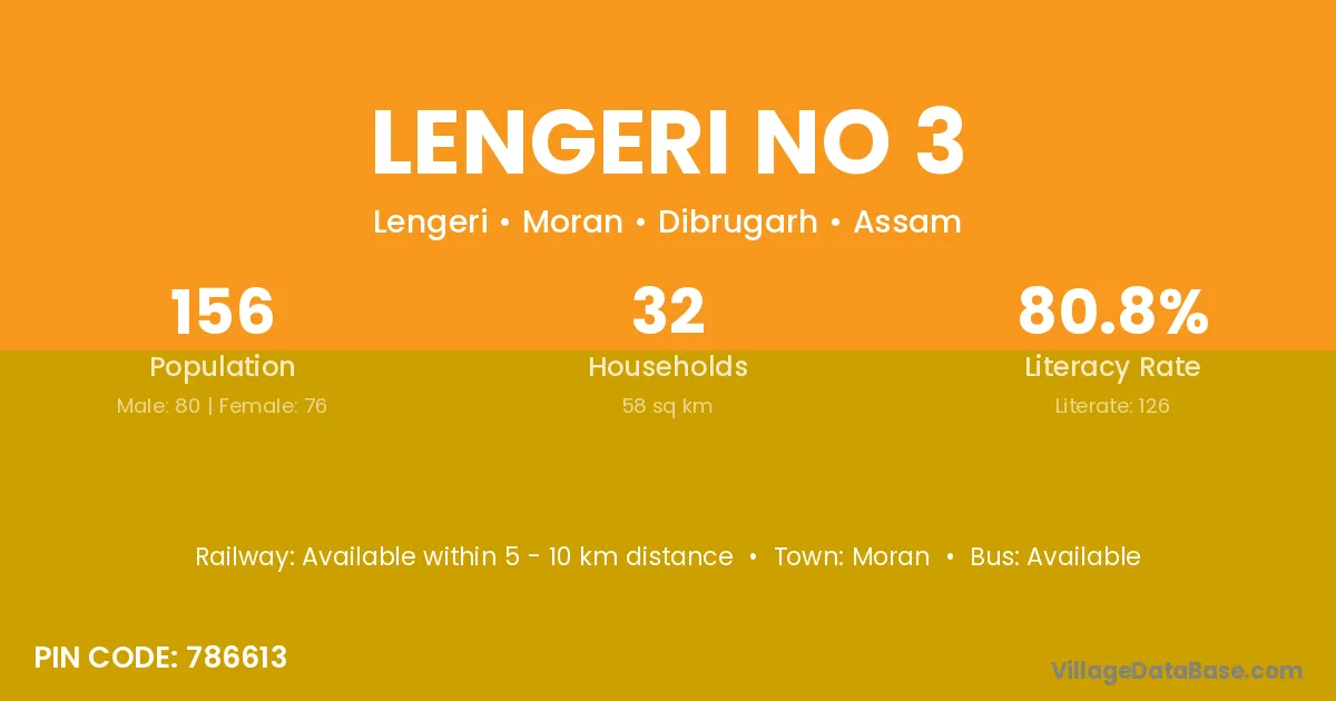 Lengeri No 3 village has a total population of 156 people, of which 80 are males and 76 are females.