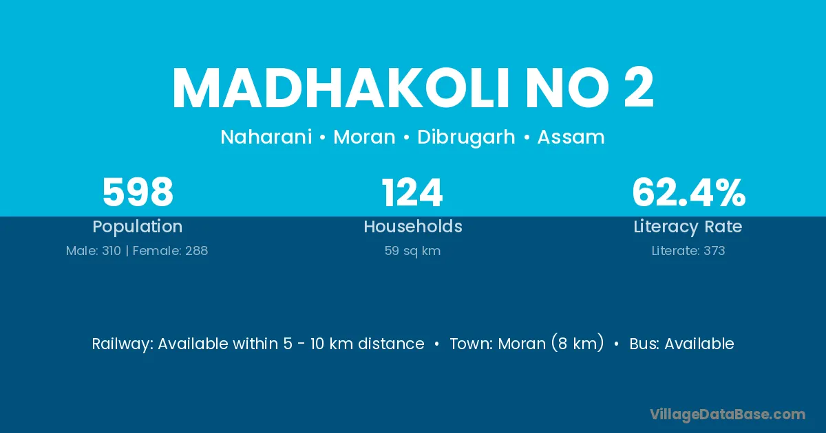 Moran (8 km) is the nearest town to Madhakoli No 2 village for major economic activities and is located approximately 8 km away.