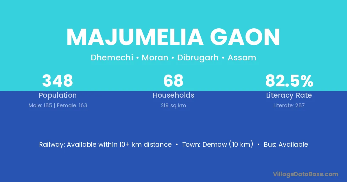 Demow (10 km) is the nearest town to Majumelia Gaon village for major economic activities and is located approximately 10 km away.