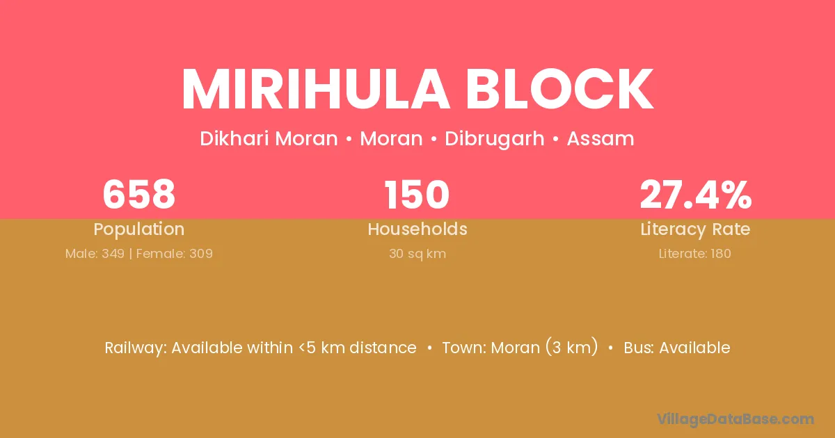 Moran (3 km) is the nearest town to Mirihula Block village for major economic activities and is located approximately 3 km away.