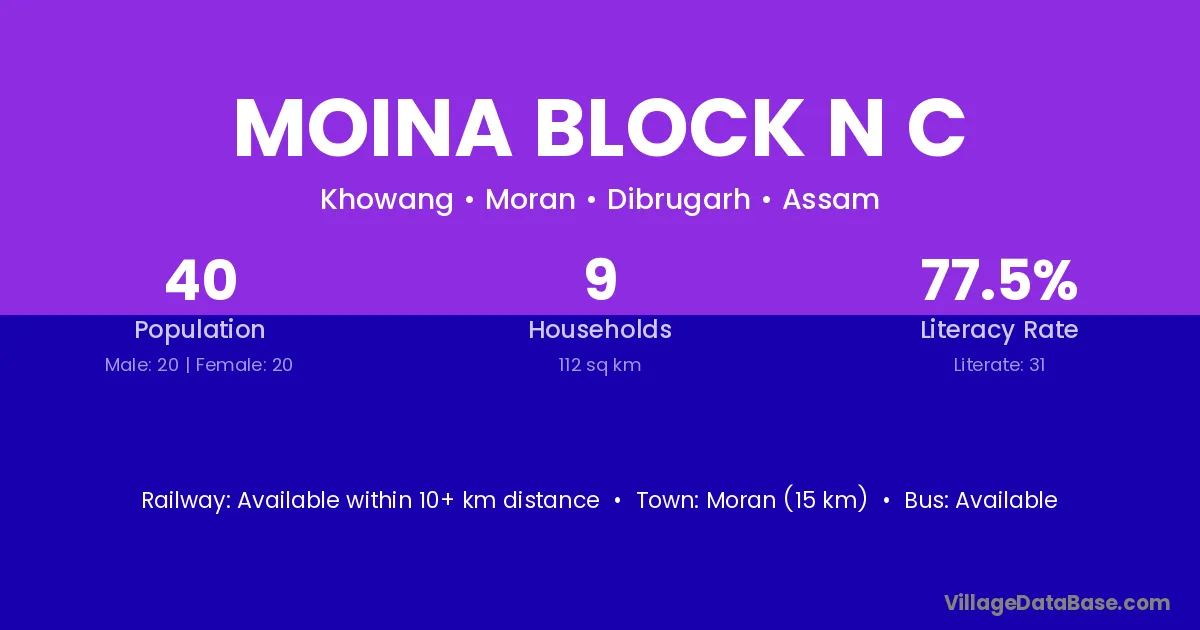 Moran (15 km) is the nearest town to Moina Block N C village for major economic activities and is located approximately 15 km away.