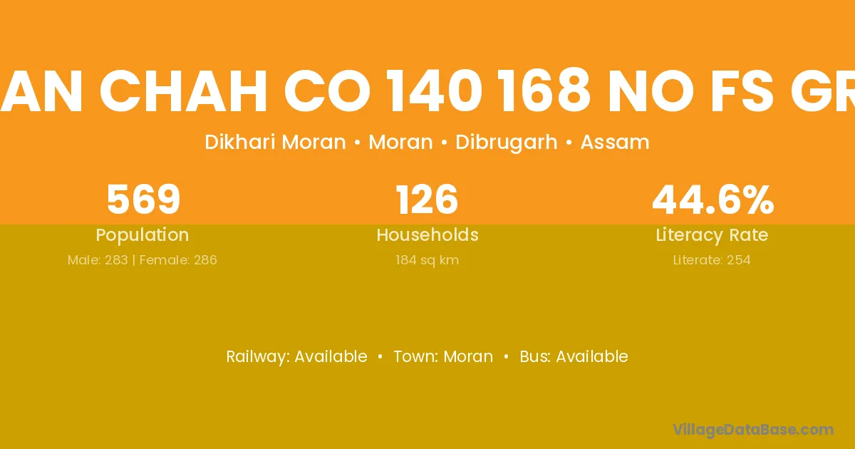 The literacy rate of Moran Chah Co 140 168 No Fs Grant village is 44.64%. Male literacy stands at 54.06% and female literacy at 35.31%.