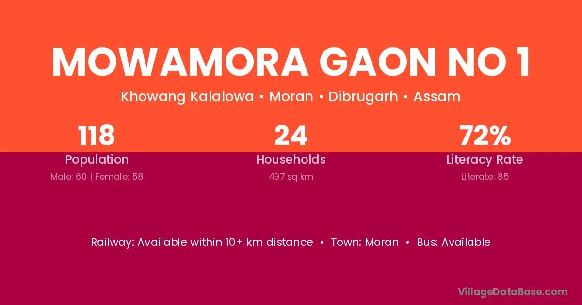 Mowamora Gaon No 1 village has a total population of 118 people, of which 60 are males and 58 are females.