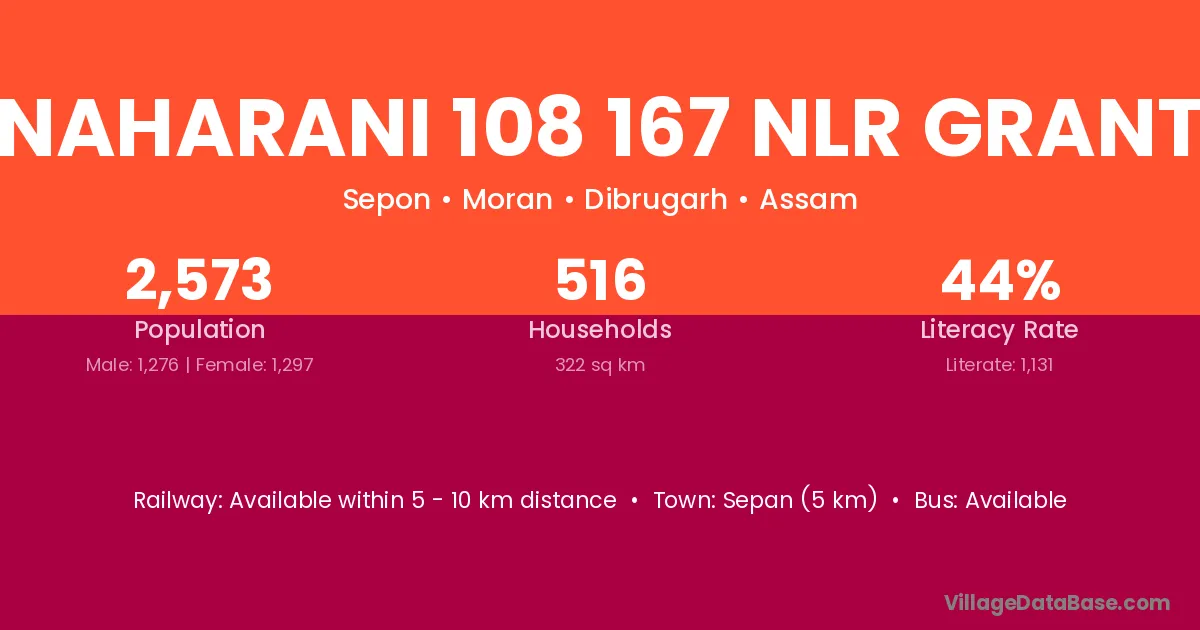 Naharani 108 167 Nlr Grant village has a total population of 2,573 people, of which 1,276 are males and 1,297 are females.