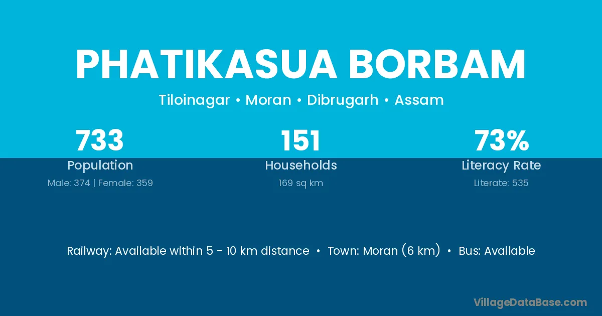 Phatikasua Borbam village has a total population of 733 people, of which 374 are males and 359 are females.
