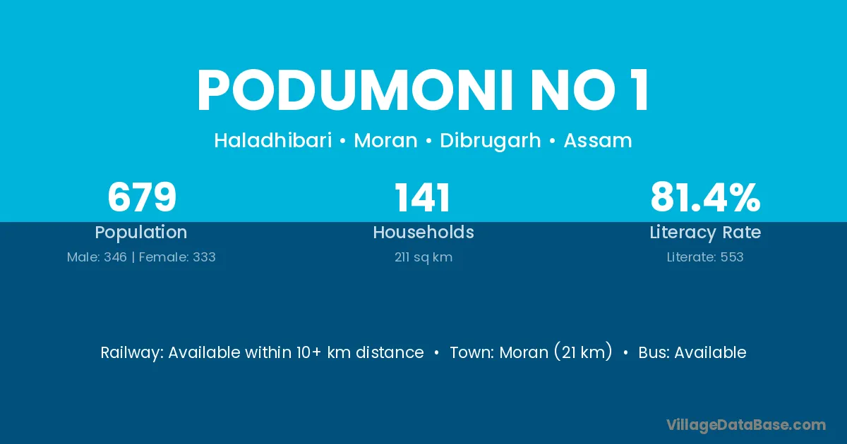 Moran (21 km) is the nearest town to Podumoni No 1 village for major economic activities and is located approximately 21 km away.