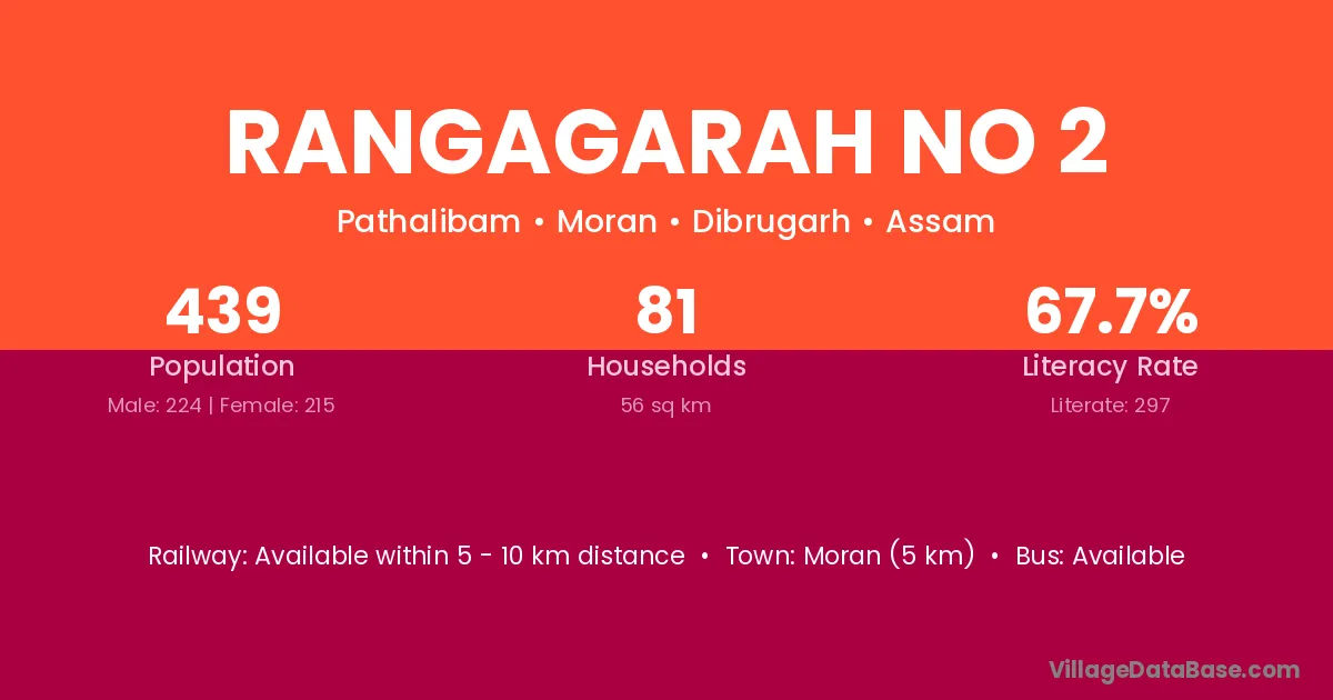 Moran (5 km) is the nearest town to Rangagarah No 2 village for major economic activities and is located approximately 5 km away.