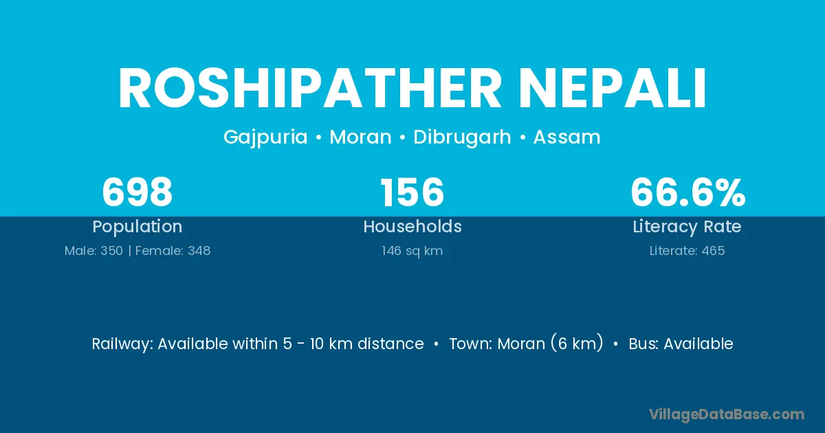 Moran (6 km) is the nearest town to Roshipather Nepali village for major economic activities and is located approximately 6 km away.