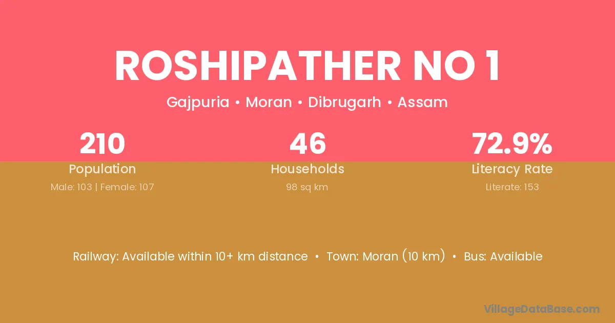 Moran (10 km) is the nearest town to Roshipather No 1 village for major economic activities and is located approximately 10 km away.
