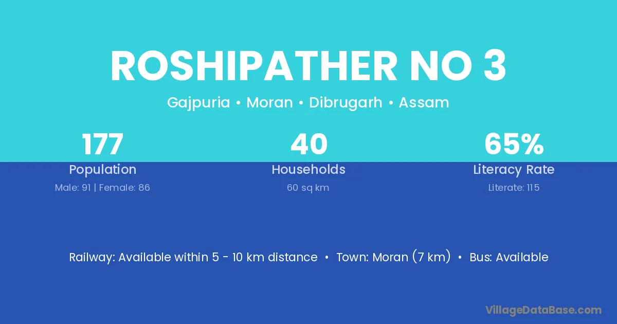Moran (7 km) is the nearest town to Roshipather No 3 village for major economic activities and is located approximately 7 km away.
