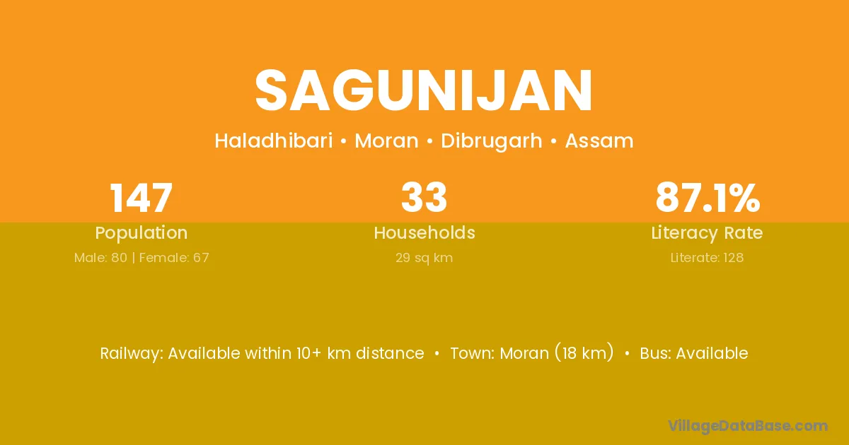Moran (18 km) is the nearest town to Sagunijan village for major economic activities and is located approximately 18 km away.