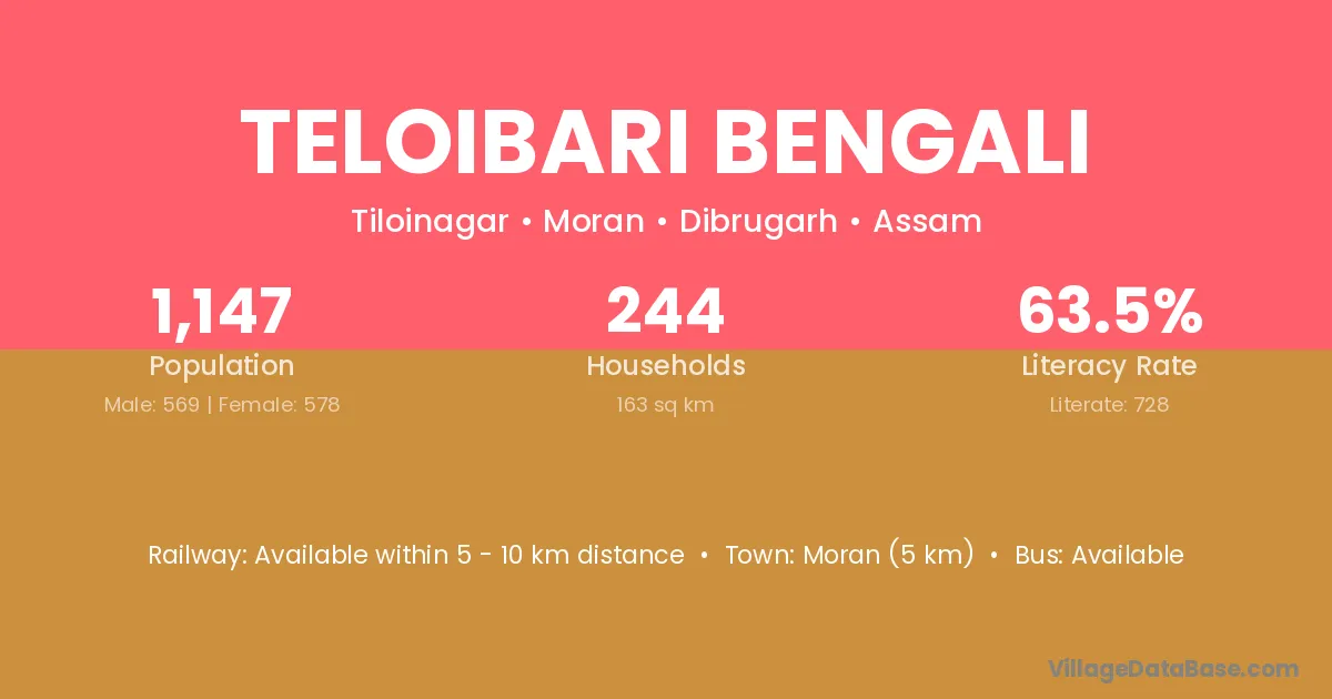 Moran (5 km) is the nearest town to Teloibari Bengali village for major economic activities and is located approximately 5 km away.