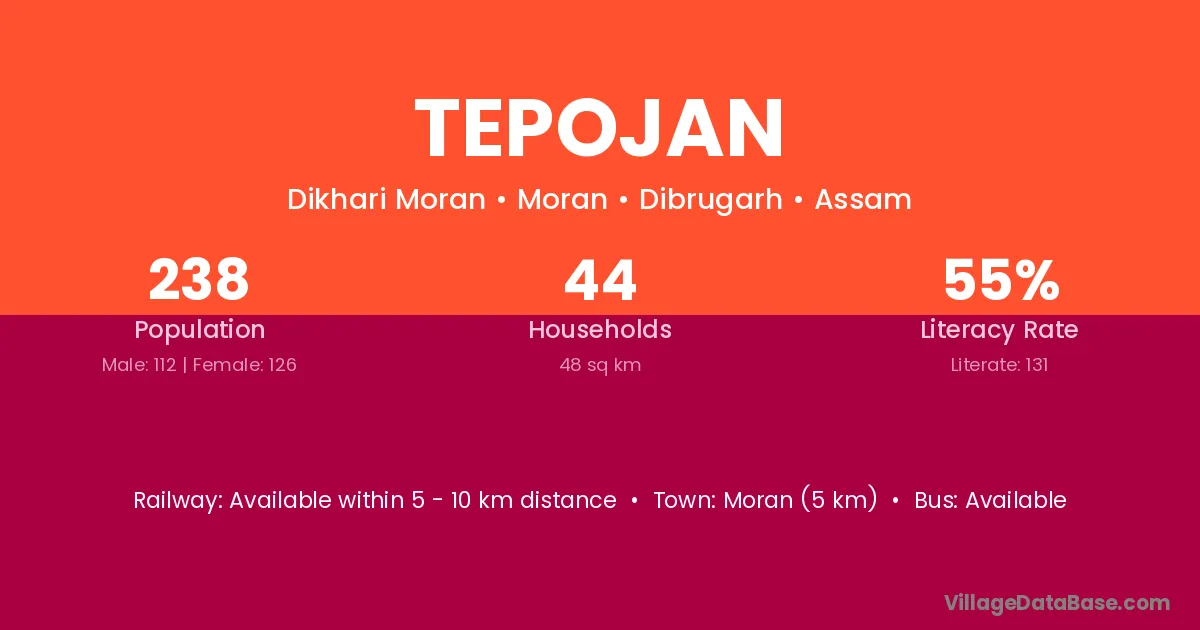 The literacy rate of Tepojan village is 55.04%. Male literacy stands at 66.96% and female literacy at 44.44%.