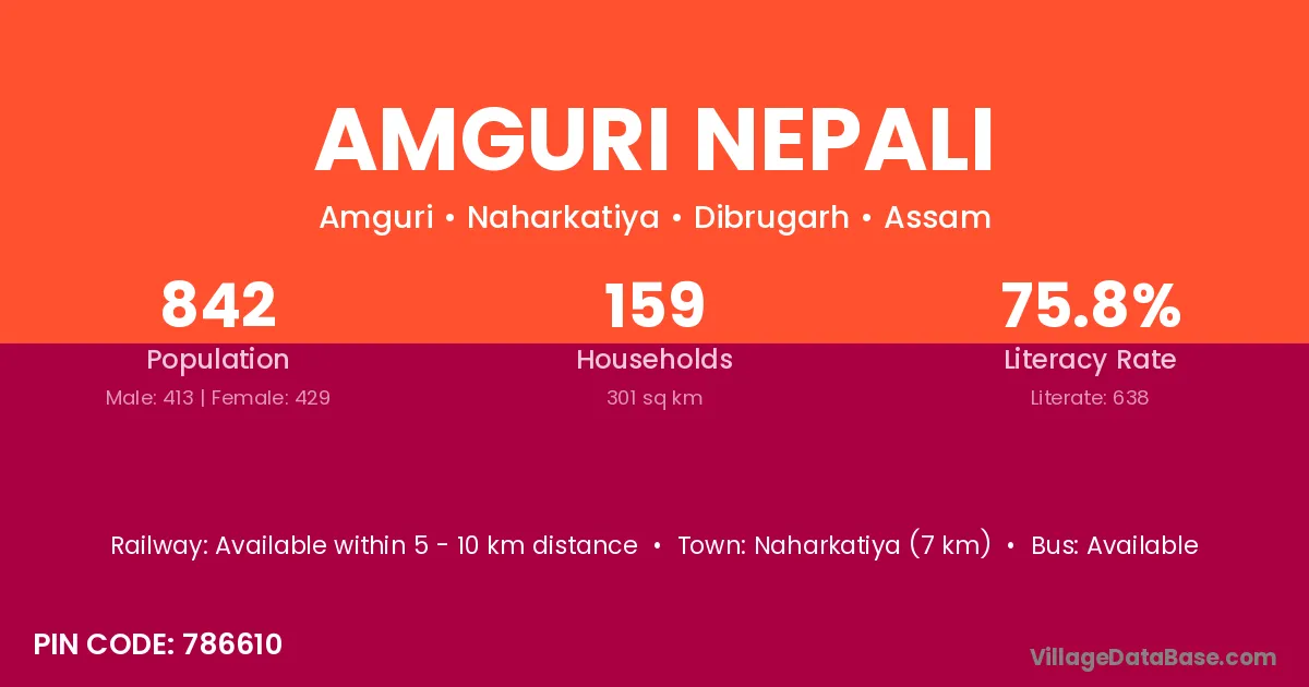 Amguri Nepali village has a total population of 842 people, of which 413 are males and 429 are females.