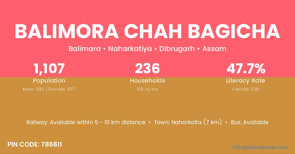 Naharkatia (7 km) is the nearest town to Balimora Chah Bagicha village for major economic activities and is located approximately 7 km away.