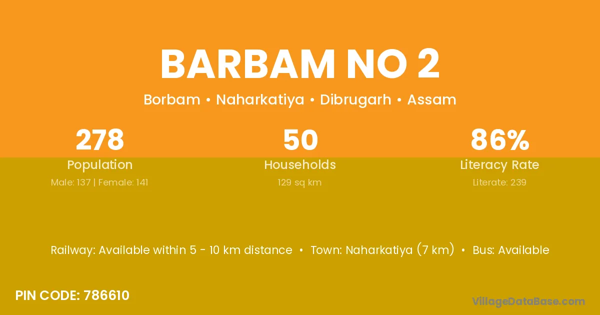 Naharkatiya (7 km) is the nearest town to Barbam No 2 village for major economic activities and is located approximately 7 km away.