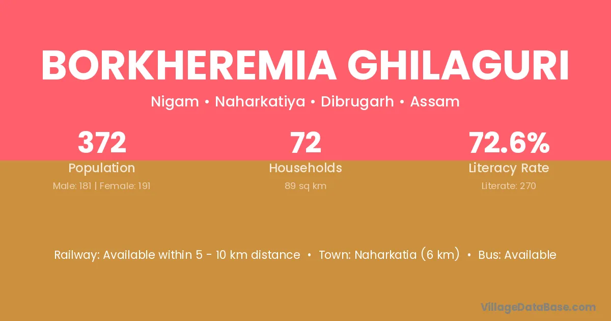 Naharkatia (6 km) is the nearest town to Borkheremia Ghilaguri village for major economic activities and is located approximately 6 km away.