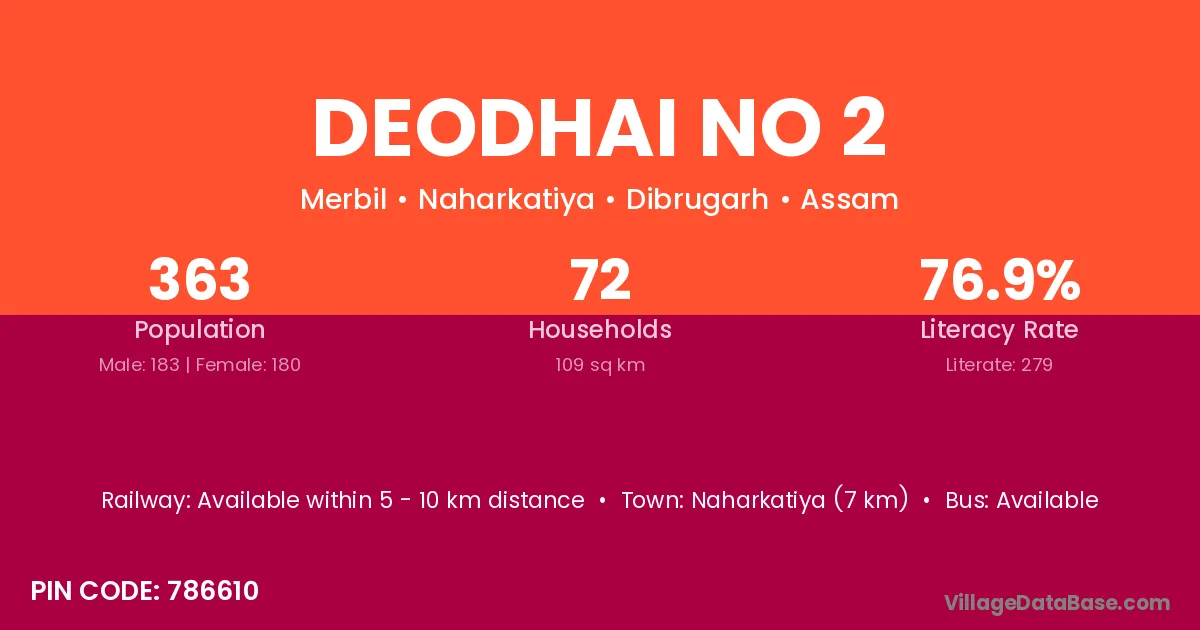 Naharkatiya (7 km) is the nearest town to Deodhai No 2 village for major economic activities and is located approximately 7 km away.