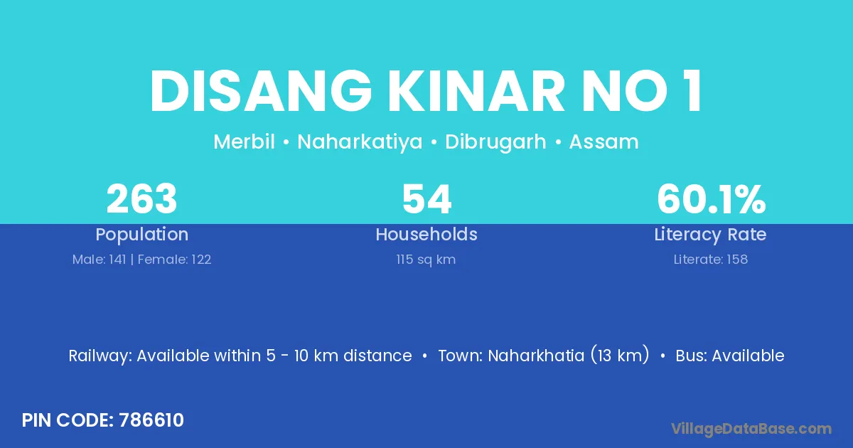 Naharkhatia (13 km) is the nearest town to Disang Kinar No 1 village for major economic activities and is located approximately 13 km away.