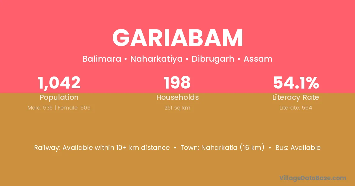 Naharkatia (16 km) is the nearest town to Gariabam village for major economic activities and is located approximately 16 km away.
