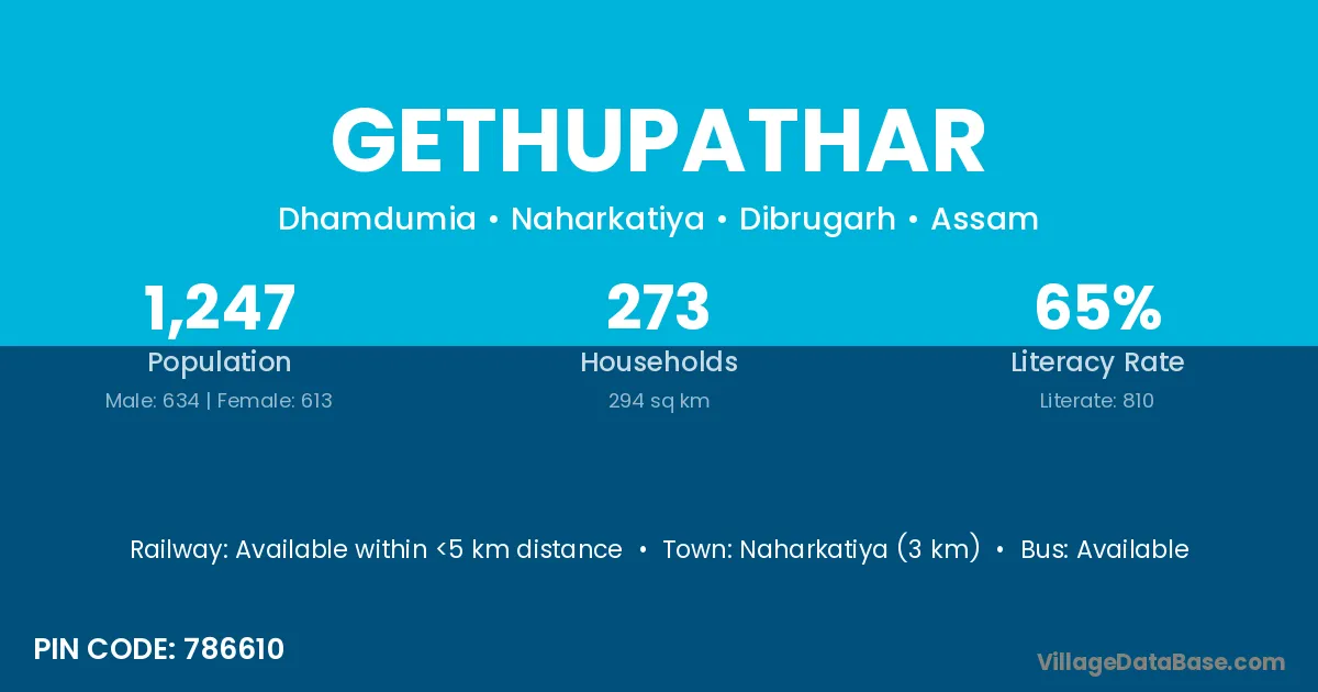 Gethupathar village has a total population of 1,247 people, of which 634 are males and 613 are females.