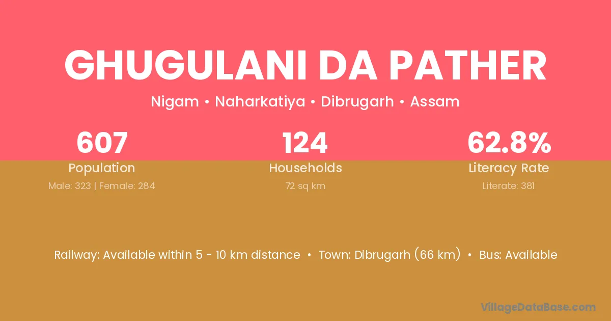Dibrugarh (66 km) is the nearest town to Ghugulani Da Pather village for major economic activities and is located approximately 66 km away.