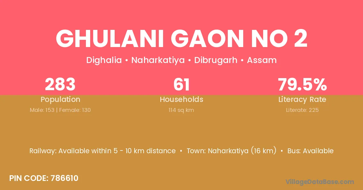 Ghulani Gaon No 2 village has a total population of 283 people, of which 153 are males and 130 are females.