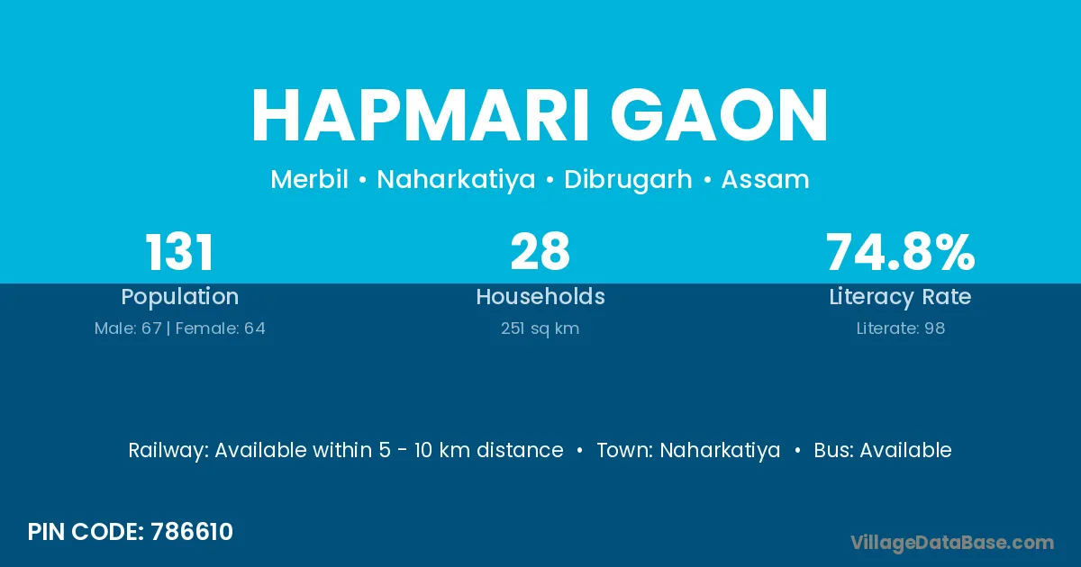 Hapmari Gaon village has a total population of 131 people, of which 67 are males and 64 are females.
