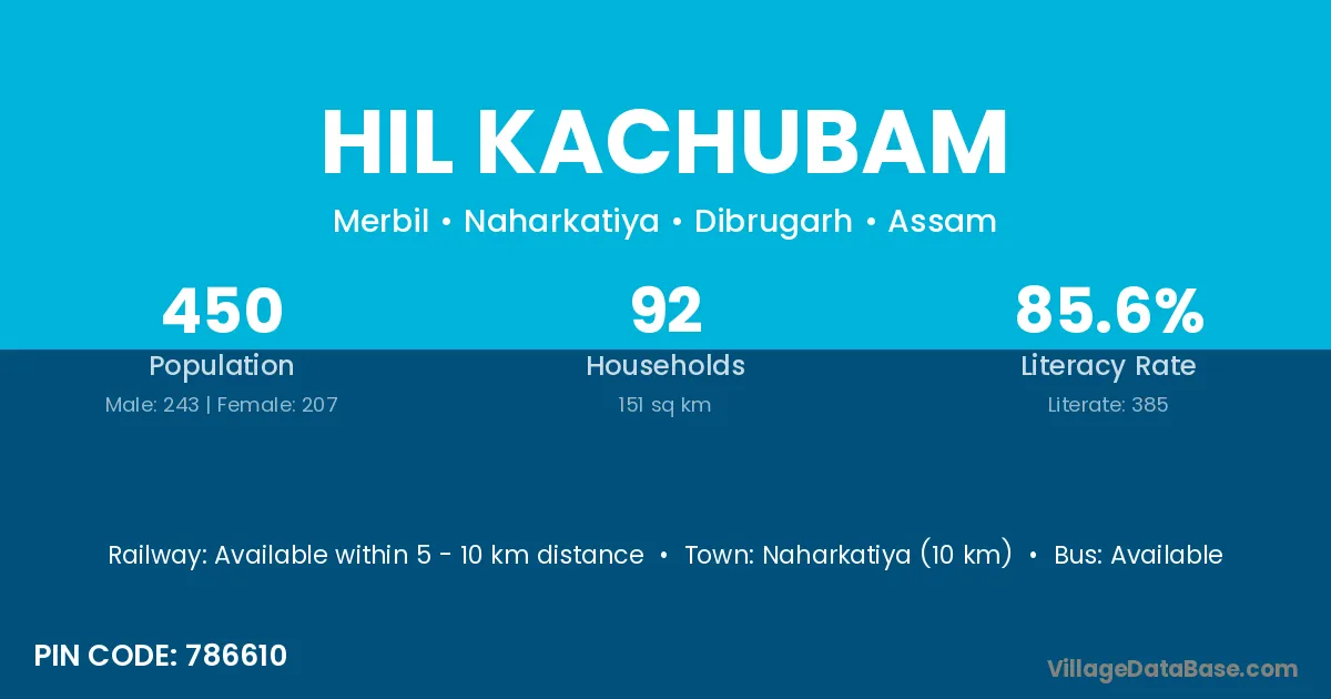 Naharkatiya (10 km) is the nearest town to Hil Kachubam village for major economic activities and is located approximately 10 km away.