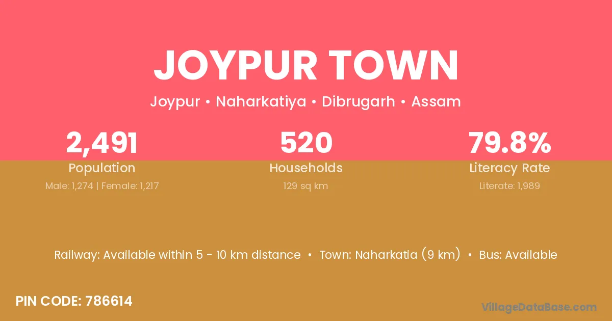 Naharkatia (9 km) is the nearest town to Joypur Town village for major economic activities and is located approximately 9 km away.