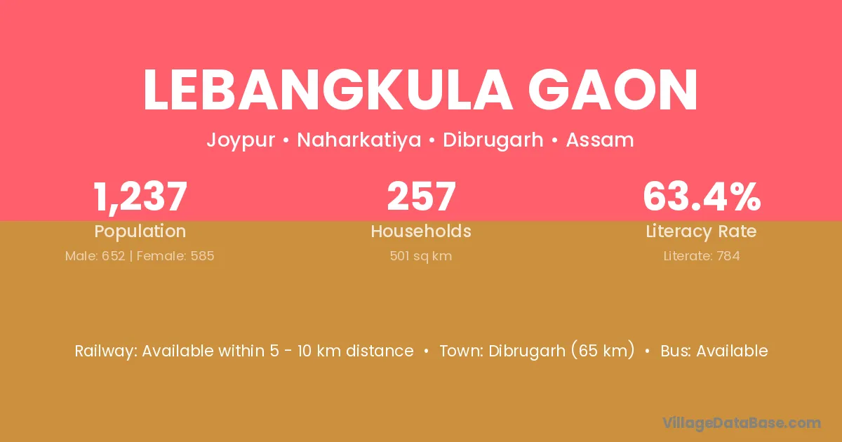 Lebangkula Gaon village has a total population of 1,237 people, of which 652 are males and 585 are females.