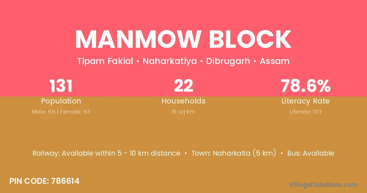Naharkatia (5 km) is the nearest town to Manmow Block village for major economic activities and is located approximately 5 km away.