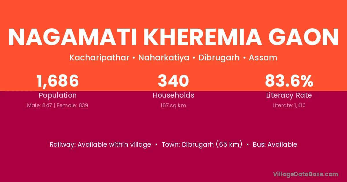 Dibrugarh (65 km) is the nearest town to Nagamati Kheremia Gaon village for major economic activities and is located approximately 65 km away.