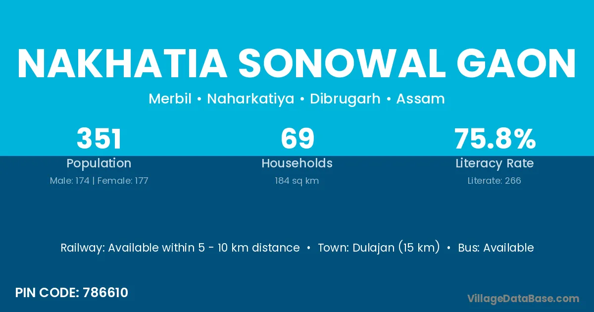 Nakhatia Sonowal Gaon village has a total population of 351 people, of which 174 are males and 177 are females.