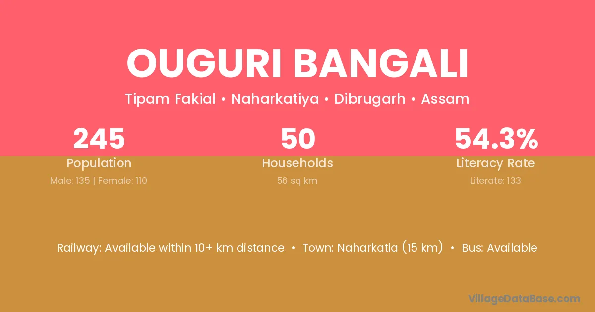 Naharkatia (15 km) is the nearest town to Ouguri Bangali village for major economic activities and is located approximately 15 km away.
