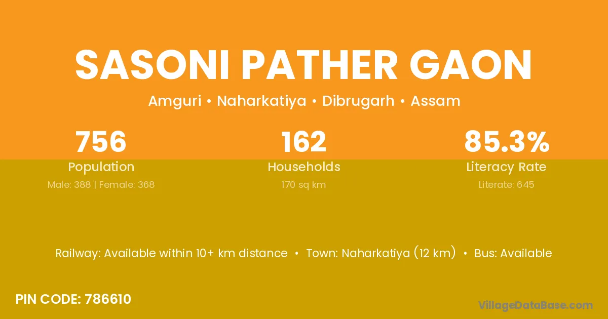 Sasoni Pather Gaon village has a total population of 756 people, of which 388 are males and 368 are females.