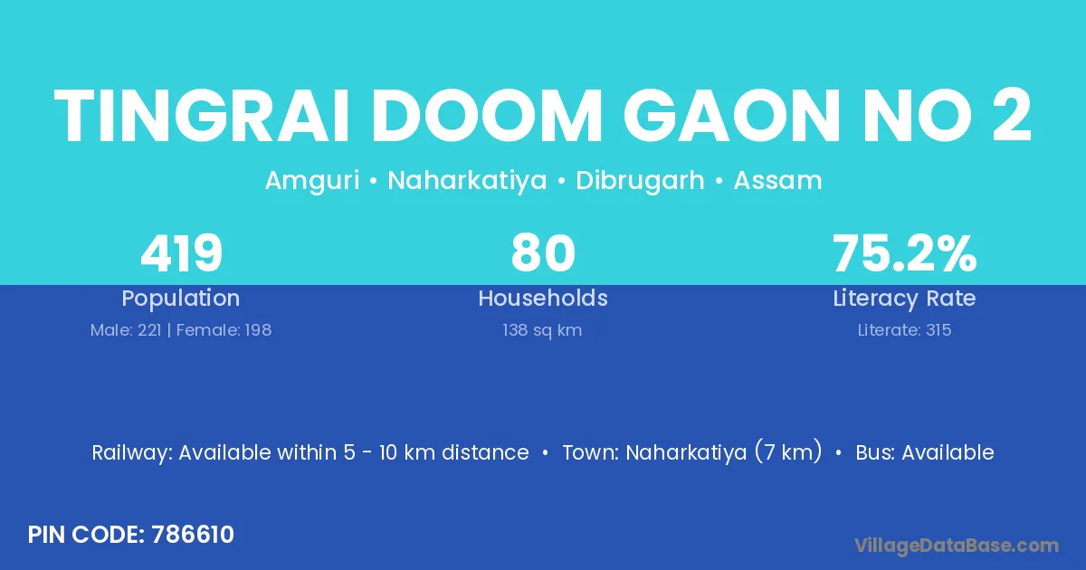 Tingrai Doom Gaon No 2 village has a total population of 419 people, of which 221 are males and 198 are females.