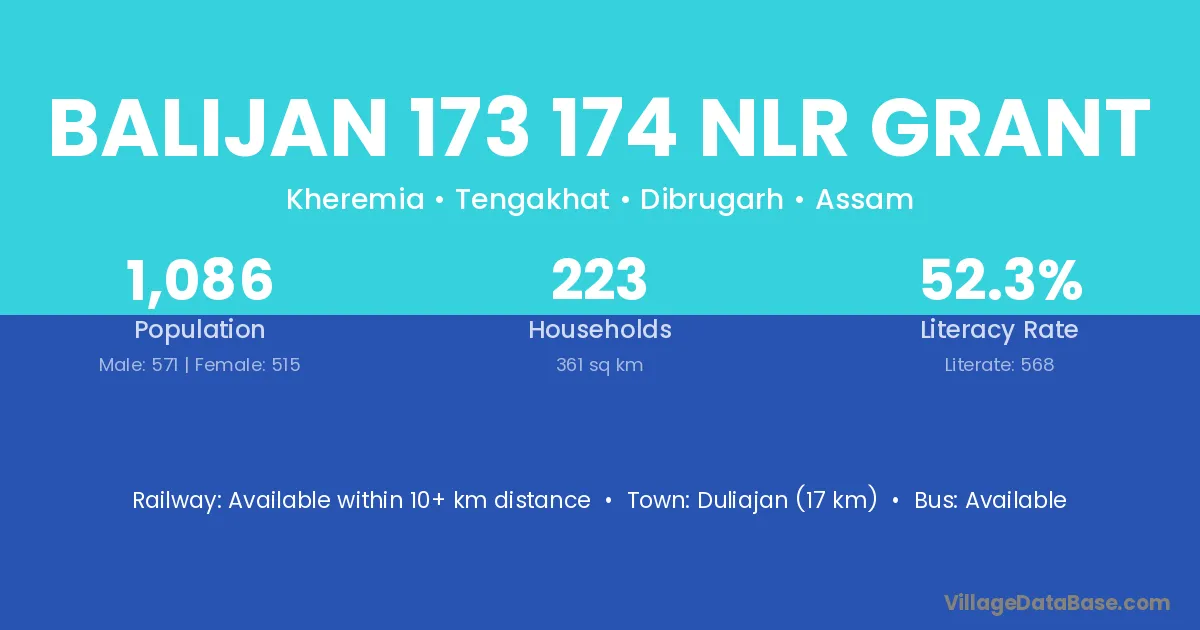 Duliajan (17 km) is the nearest town to Balijan 173 174 Nlr Grant village for major economic activities and is located approximately 17 km away.